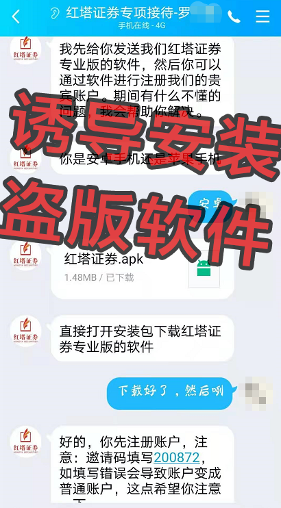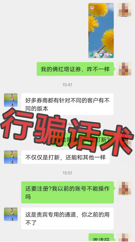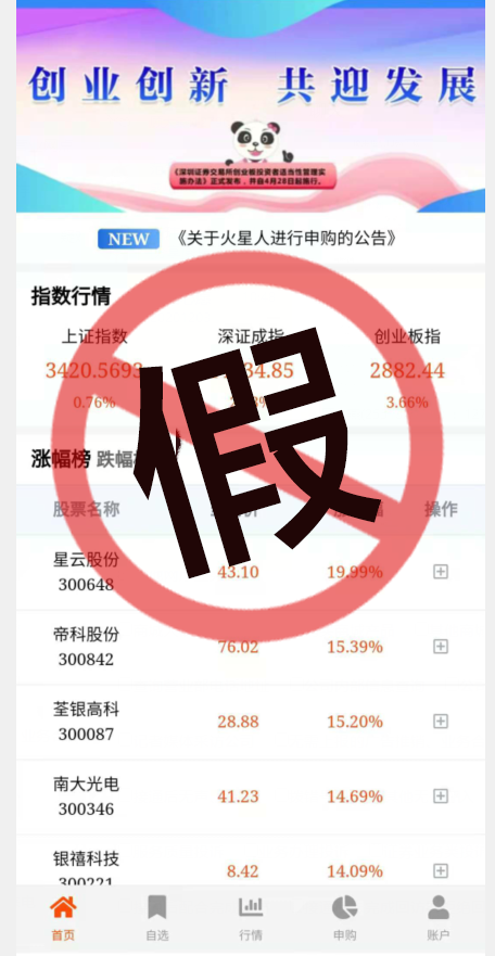 随着社交软件以及互联网直播平台的发展,部分非法证券活动凭风借力,更广泛地、以更低的成本进行宣传和诱导投资者。本次骗局通过一些自称“专家”、“老师”或是“股票私人导师”的人,打着“贵宾账户”、“机构特有打新软件”等特殊待遇的名义,取得投资者信任后利用仿冒APP诱骗投资者转账付款。