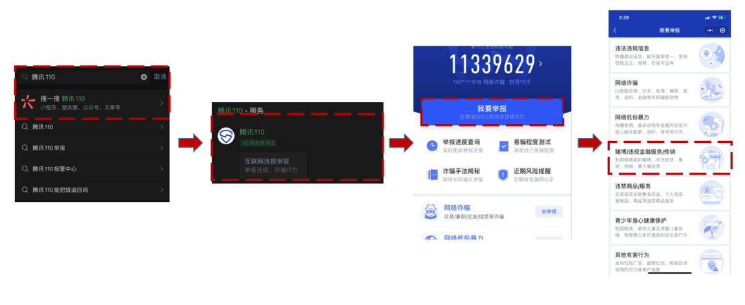 如发现冒充他人、编造虚假信息、诱使打款转账、非法荐股等以电话、网络、短信的方式实施的欺诈行为,可以直接通过微信客户端和小程序“腾讯110”对此类违法违规行为进行投诉和反馈。